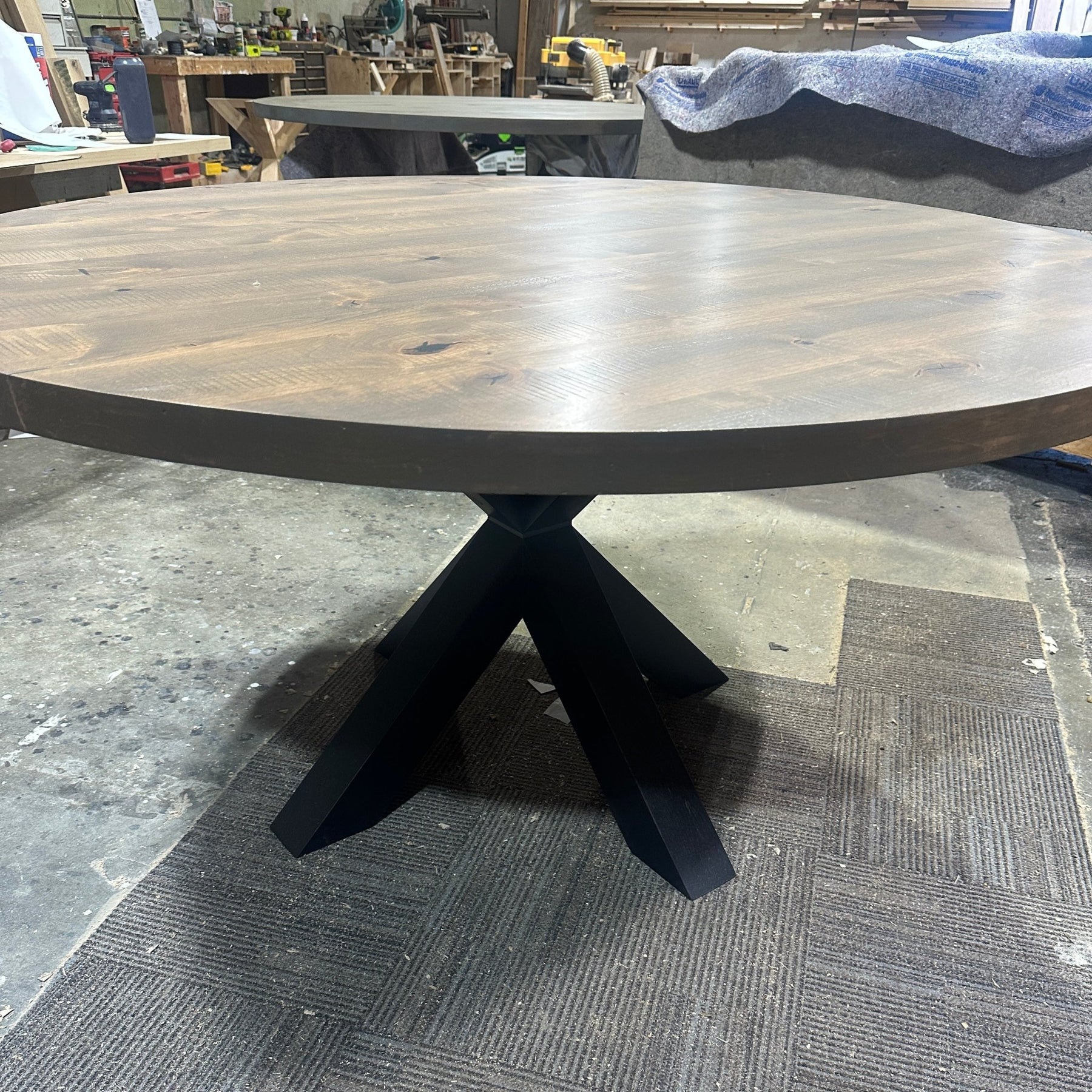 This handcrafted Lance model round dining table serves as a stunning centerpiece for rustic, farmhouse, or modern homes. Expertly crafted from premium Knotty Alder and designed for lasting beauty, it combines timeless style with practical functionality. Ready to ship — no waiting to build!